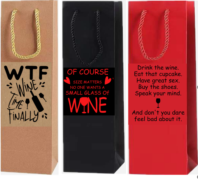 These wine bags for wine bottles gifts are edgy and fun (possibly true haha). Use as a wine carrier, a wine tote, wine bags for gifts and enjoy the fun sayings.